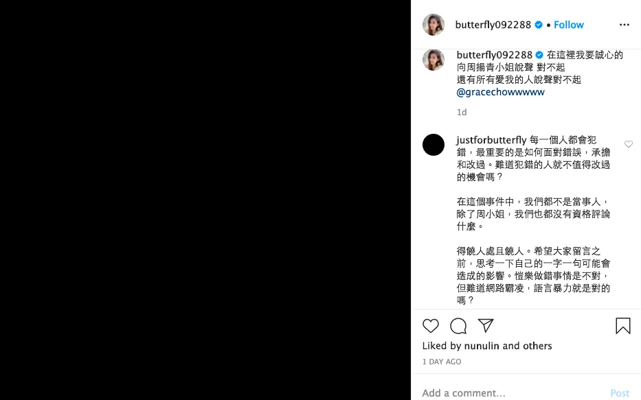 Grace confirmed in the comments that the “Butterfly (蝴蝶)” was in reference to Linda Chien Kai-le’s old stage name. In the spirit of generosity, the Chinese beauty even tagged Linda’s Instagram account @butterfly092288. Netizens also pointed out that Grace had been purposefully posting a bunch of butterfly pictures since early April.