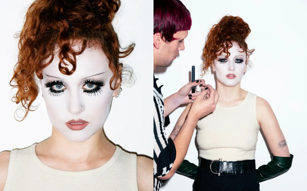 “I drew from film-noir monochrome and 1930s military references and then layered in her signature high glamour. The stark white base and erased brows created a clean canvas for sculpted dimension, while the eyes were built with cool greys and deep blacks to evoke a moody, cinematic intensity. We finished with a custom chunky frosted-tip glitter lash that adds a playful, hyper-feminine contrast to the structure of the look, capturing the theatrical spirit Chappell brings to every transformation.”