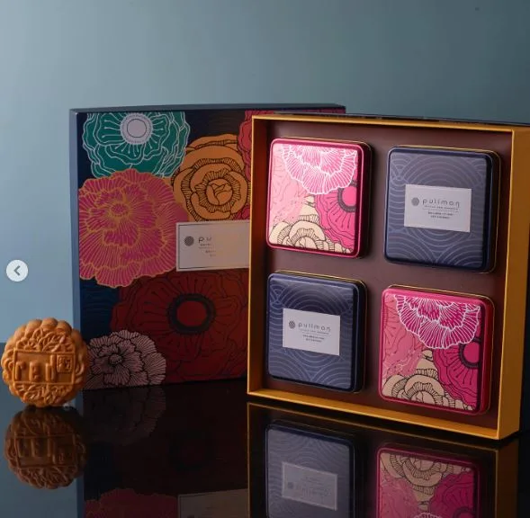 The gift box consists of four individual tin boxes, each adorned with a unique peony pattern. It can be recycled for daily use, as the box is environmentally friendly and harmless to nature. The set offers a choice between baked or snow skin mooncakes.