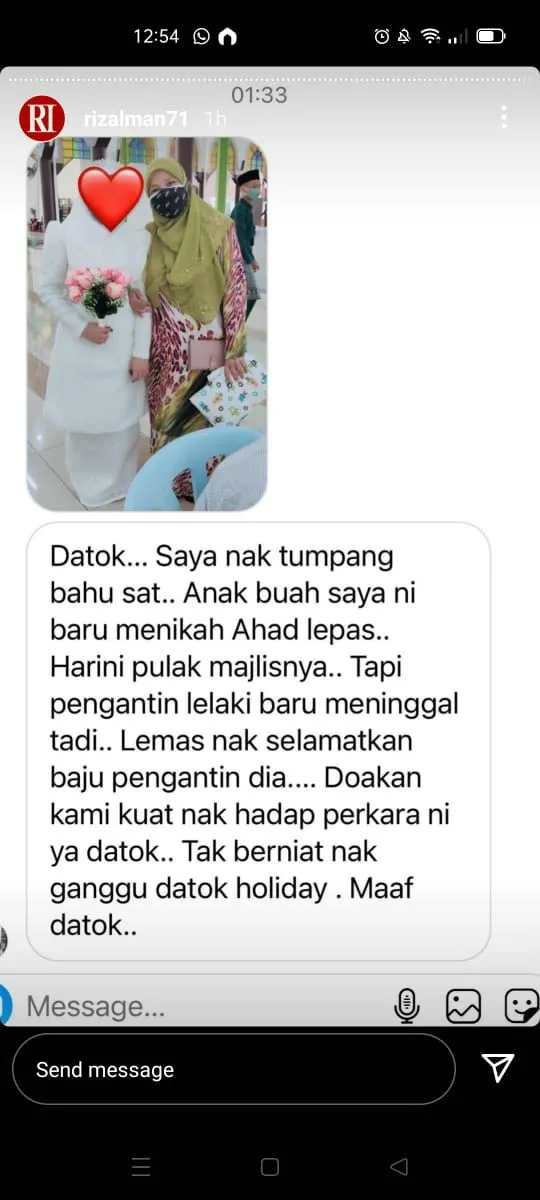 One of the late Muhammad Syafiq’s relative messaged renowned Malaysian fashion designer, Rizalman, to ask for a favour; to deliver a message to the public in order to extend prayers for Muhammad Syafiq. She sorrowfully stated in the Instagram message, “Dato’, will you lend me a shoulder? My niece just got married last Sunday (12th December), and today (19th December) was supposed to be the wedding reception. But the groom just passed away. (He) drowned trying to save his wedding attire. Please keep up in your prayers, so we would be strong enough to face this. (I) didn’t mean to bother you on your holiday. My apologies, Dato’.”