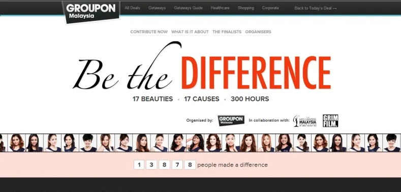 Through a special microsite hosted by Groupon, Malaysians were given over 300 hours to contribute to 17 separate causes which were chosen by the 17 finalists of Miss Universe Malaysia 2013 and the full proceeds generated by “Be The Difference” campaign has been channeled to 17 charity organisations including: