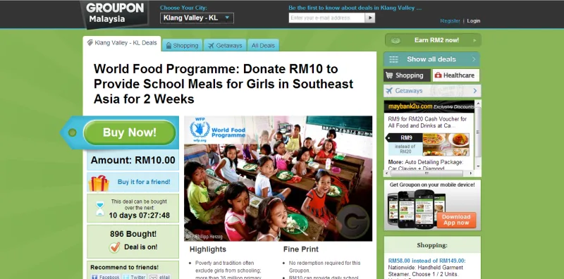 From 25th March until 5th April 2013, Groupon will call on the general public to help provide a child with WFP school meals for four weeks and with a monthly ration to take home. 100% of donations go directly to WFP’s School Meals Programmes, implemented in 14 countries in Asia, including five countries in Southeast Asia.