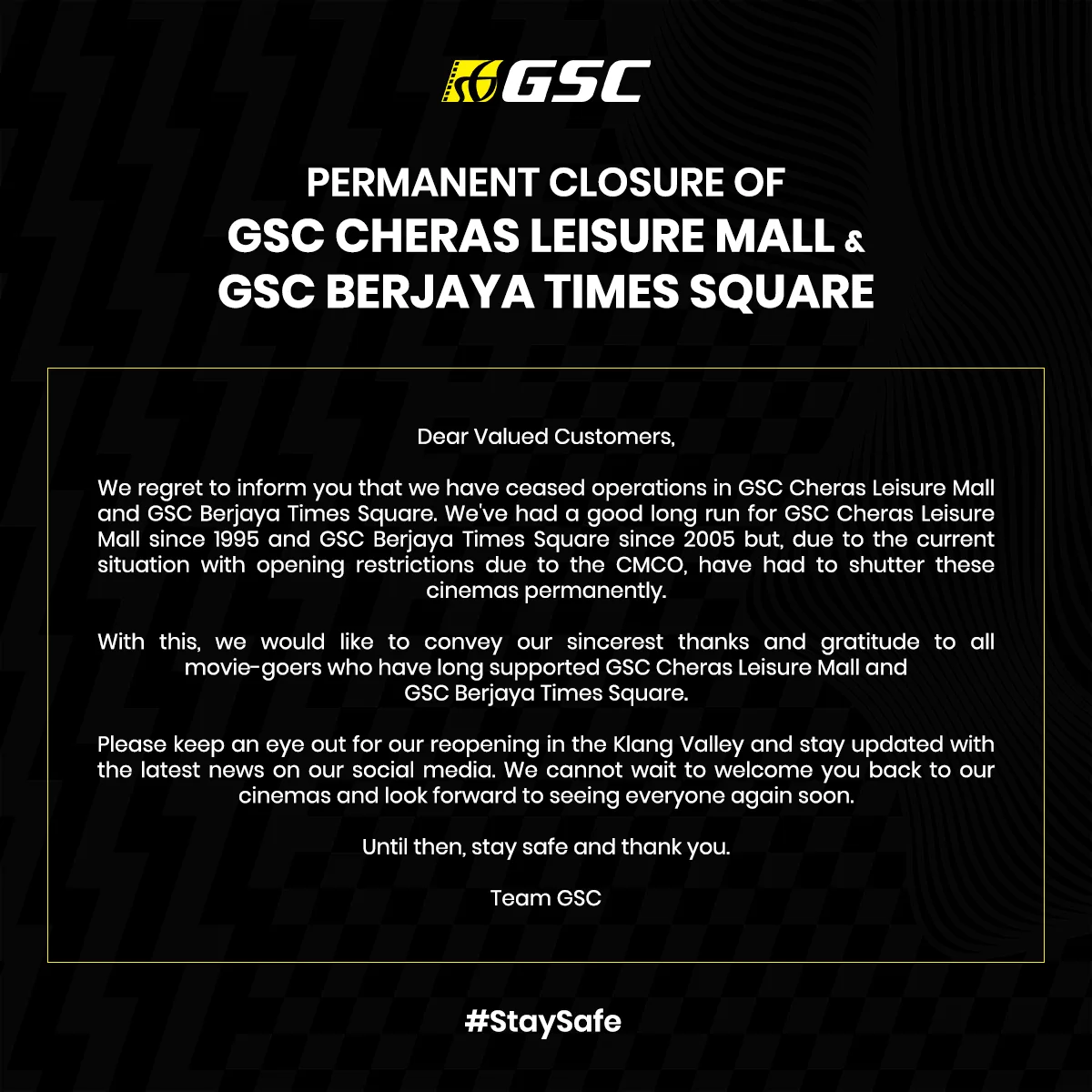 With this, we would like to convey our sincere thanks and gratitude to all movie-goers who have long supported GSC Cheras Leisure Mall and GSC Berjaya Times Square.