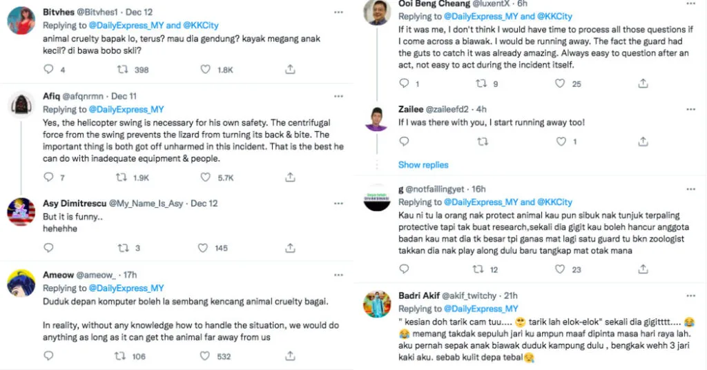 “Yes, the helicopter swing is necessary for his own safety,” Twitter user @afqnrmn shared. “The centrifugal force from the swing prevents the lizard from turning its back to bite. The important thing is both got off unharmed in this incident. That is the best he can do with inadequate equipment and people.”