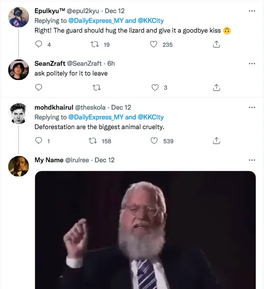 One Twitter netizen wrote, “(Instead of tossing) the guard should hug the lizard and give it a goodbye kiss instead!” For those interested, feel free to read some of the responses left by them below: