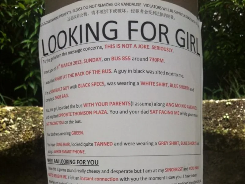 Guy decides to take the bus like any other day that one fine evening. Guy (sorta) meets girl on bus. Guy feels like it must be fate at work. Guy and girl go their separate ways (read: get off the bus at their respective stops). Guy hasn’t stopped thinking about girl ever since. So, what does he do?