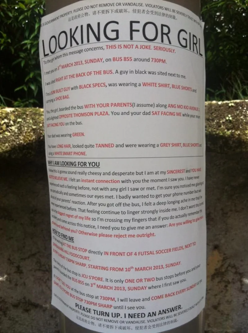 He needed to make sure that he gets her attention, right? Something big, something out of this world. Something that would spread like wildfire, somehow. So, he left a random poster (we think, pasted on a lamppost, maybe?) with notes describing his entire experience and justifying his reason for doing so: