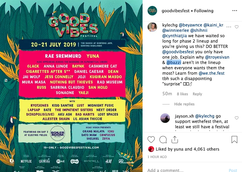 Having said that, not everyone were thrilled at the Phase 2 line-up for Good Vibes Festival 2019. Instagram users @shazalomaniac and @kylechg expressed their disappointment at the event organiser for not being able to secure popular international artists like Troye Sivan and Bazzi.