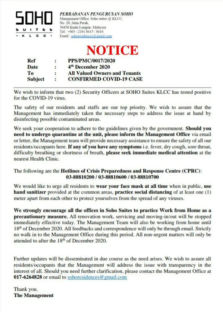 On the 4th of December, the management of Soho Suites KLCC apartments informed residents that two security officers working there tested positive for Covid-19. Management has advised residents to take precautionary measures to prevent the spread of the virus. Furthermore, all renovation work, servicing and non-essential movement will be restricted until the 18th of December.