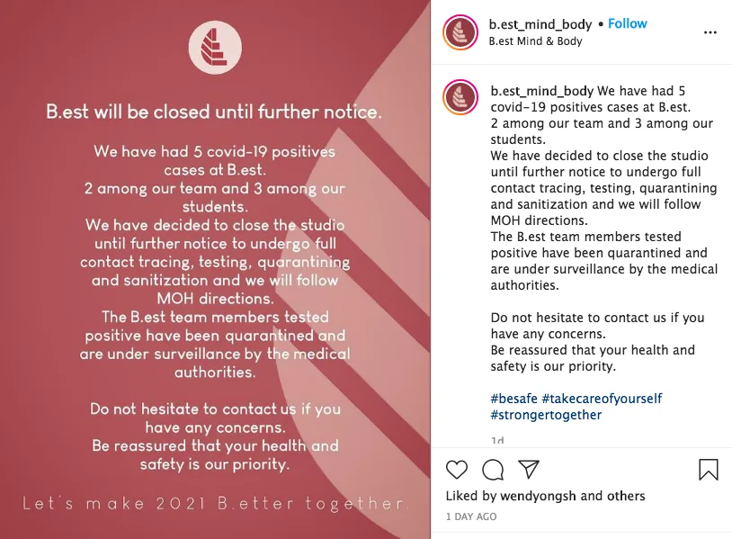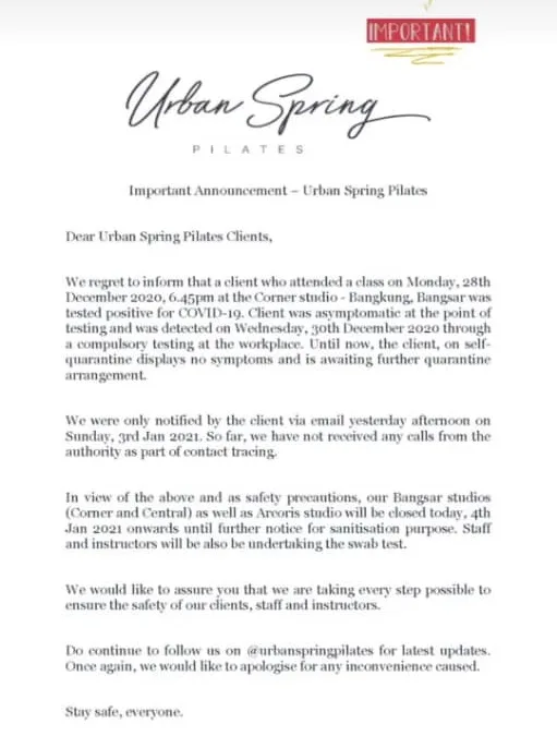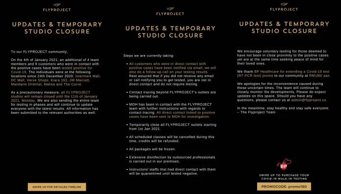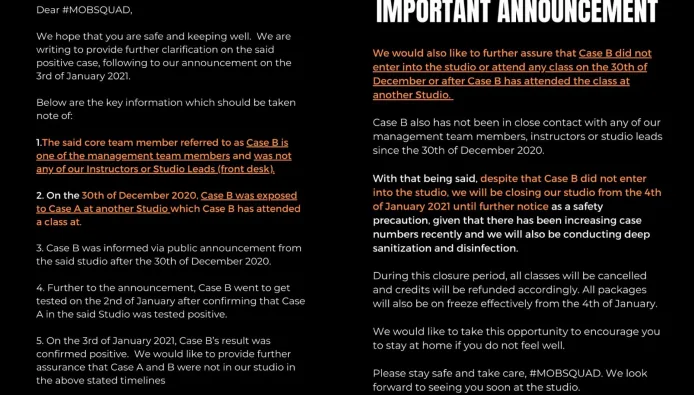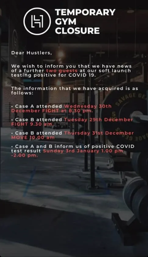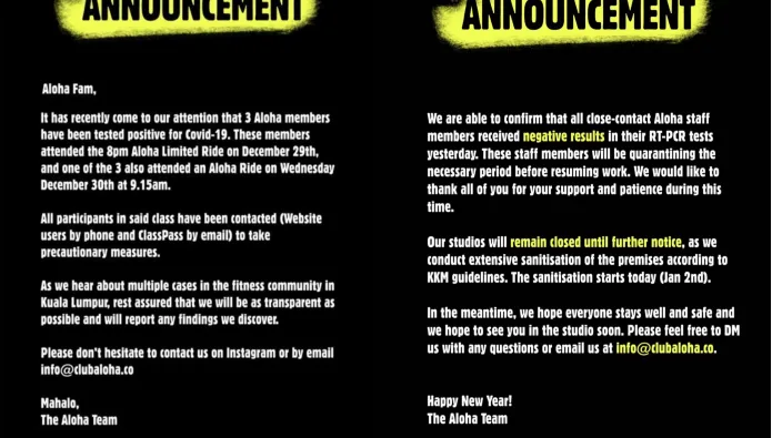 - 3 gym-goers who attended the Aloha Limited Ride on 29th and 30th December tested positive for Covid. The studio has been closed since last week.