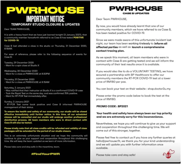 - A member who tested positive for Covid informed the studio over the weekend on Sunday (3rd January 2020).