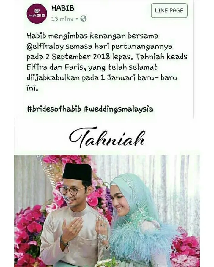 The caption of the photo read, “Habib recalls memories of Elfira Loy during her engagement day on 2nd September 2018. Congratulations to Elfira and Haris who recently married on 1st January 2019.”