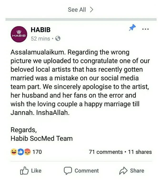 Habib later shared an apology post which has now been removed as well. The company explained that the blunder was “a mistake on our social media team. We sincerely apologise to the artist, her husband, and her fans on the error and wish the loving cups a happy marriage till Jannah. InshaAllah.”