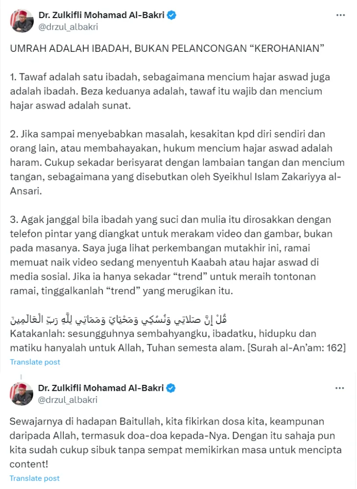 Local Islamic scholar Dr. Zulkifli Mohamad Al-Bakri also spoke about the issue, condemning the act of creating content during the pilgrimage. In his post, the scholar wrote, “Pilgrimage (Umrah) is an act of worship, not a spiritual holiday.”. He explained that kissing the stone is part of the pilgrimage but is not mandatory. In addition, if it requires you to fight or injure someone or yourself, the ritual is then considered forbidden (haram). While Dr. Zulkifli did not mention any names in his post, many knew he was referencing Hafiz when speaking about individuals using a religious ritual for content.