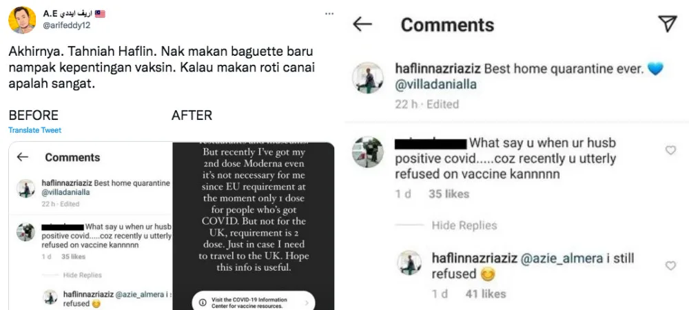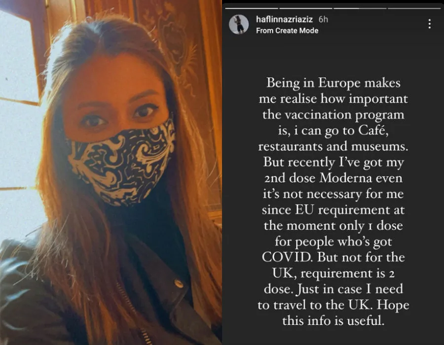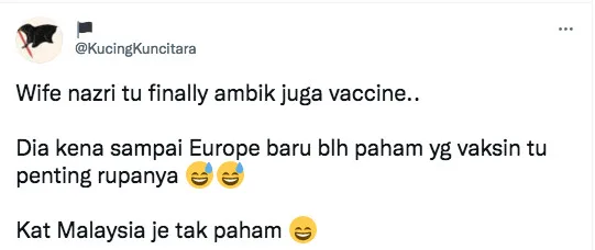 One Twitter user known as @KucingKuncitara recently uploaded a screenshot taken from Haflin’s Instagram Story. The netizen sarcastically remarked, “Nazri’s wife has finally taken the vaccine. She had to fly all the way to Europe first in order to understand that vaccine is important, apparently. When she was in Malaysia, she didn’t understand anything.”