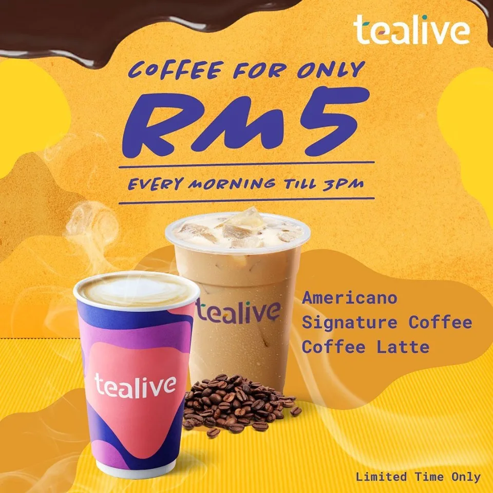 Tealive, everyone’s favourite Bubble Tea outlet is back again with another promotion. This time, the promotion is about their coffee instead. Enjoy a delicious cup coffee at just RM5. The promotion is available till 3pm is extented to Tealive selections of coffee only.