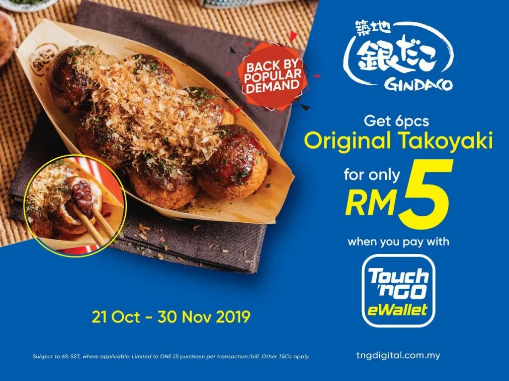 Back by popular demand, the Touch’N GO E-Wallet app promotion that brings you 6 pieces of Takoyaki for just RM5 is up and running at your nearest Gindako outlet. So if you are in need of a Japanese snack, now is as good of a time as any. Just remember to pay with the Touch ‘n Go eWallet app.