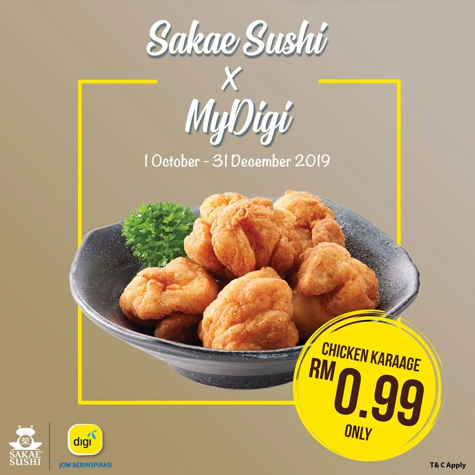 Digi is getting in on the action with their own promotion. Digi users can enjoy Sakae’s Sushi’s chicken karaage worth RM7.99 for just RM0.99. The offer, now exclusive for my Digi Rewards, will be redeemable in the Digi app for free.