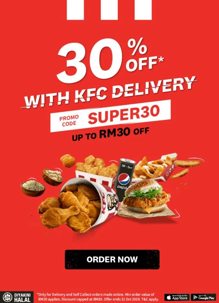 The discount will be capped at RM30 and will be available for delivery and self collect order made from the KFC app. A minimum order of RM20 is needed for the promo. Terms and condition apply.