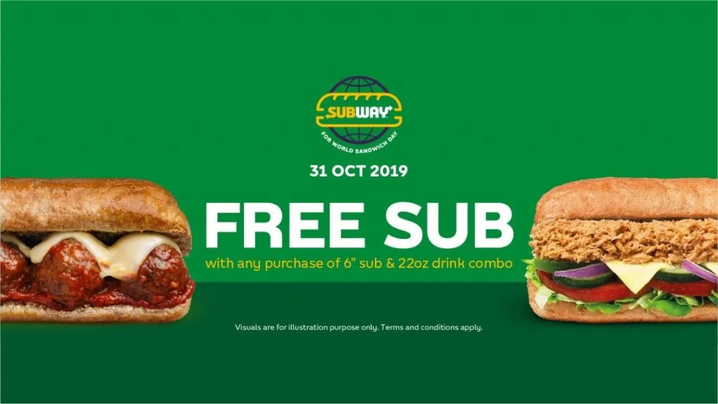 When we think of sandwiches, most of us will think of Subway. So being an icon of sandwiches worldwide, Subway is planning something big this sandwich day (31st October). So Subway is launching their promotion of a free sub (Subway sandwich) when you purchase a 6′ inch sub and drink combo on the 31st October.