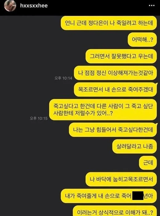“Unnie (Sister), Jung Da Eun is trying to kill me. What should I do? She’s crying now saying she made a mistake. I feel like I am slowly but surely losing my mind. She choked me and said she’ll kill me with her own two hands.