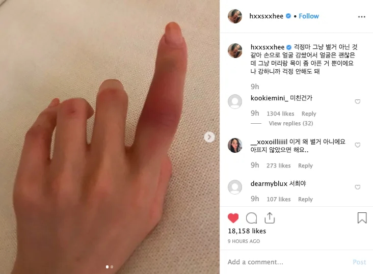 Not long after that, Seo Hee then took to the same social to post a few photos of her injured index finger and arm as a proof that she was indeed physically abused by her girlfriend.