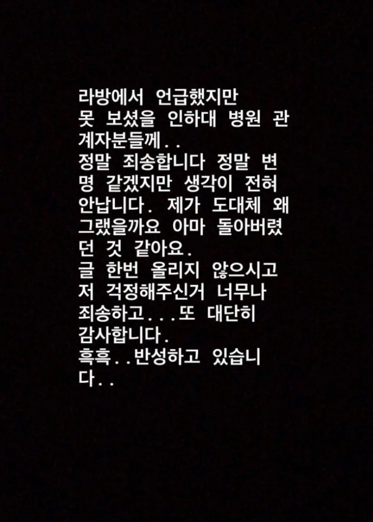 “To the Inha Hospital staff, who didn’t see my live broadcast, I’m really sorry. I know this sounds like an excuse, but I really don’t remember. Why did I act like that? I think I’ve lost my mind. I’m very thankful and sorry. Thank you for not posting anything about it online. I’m reflecting on my actions.”