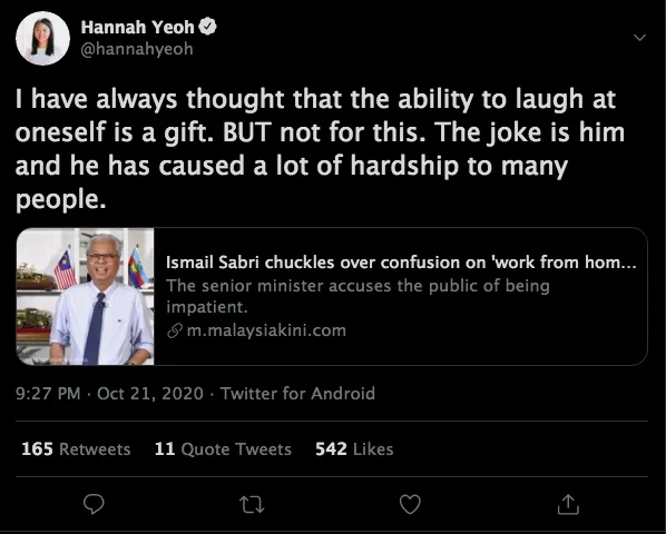 “I have always thought that the ability to laugh at oneself is a gift. BUT not for this. The joke is him and he has caused a lot of hardship to many people,” Hannah added in another post. This came as a response when the minister had the audacity to just “chuckle” after hearing about the rakyat’s confusion on the matter.