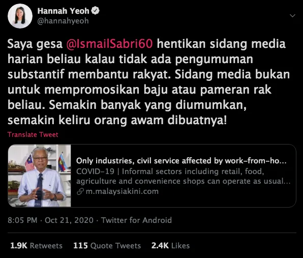“I urge Datuk Seri Ismail Sabri to stop his daily conferences, if it doesn’t provide any substantive announcements that can help the people. A media conference is not the place to promote clothes or his display rack. With every announcement, the rakyat are becoming more confused,” Hannah wrote on her Twitter.