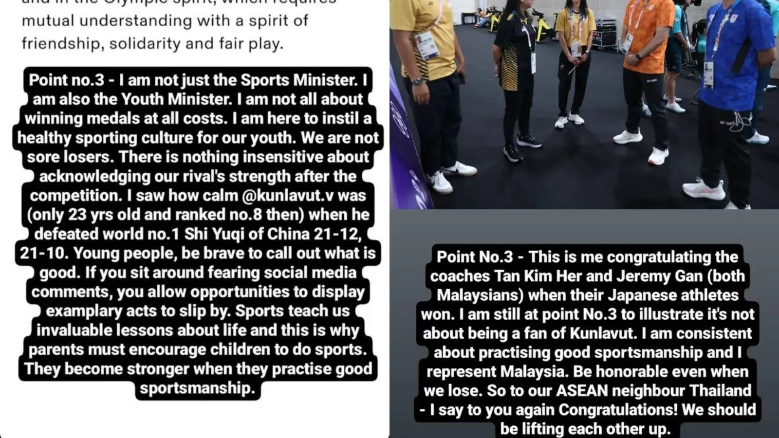 In her three-point post, the YB expressed the basic points of respect and friendship. Followed by celebrating the winners, adding that “Sportsmanship is about accepting loss when all is fair and being able to acknowledge your rivals in a respectful manner,” emphasising the importance of being unbiased when representing our country, especially during the loss of our players. Adhering to the Olympic values is crucial in these moments.