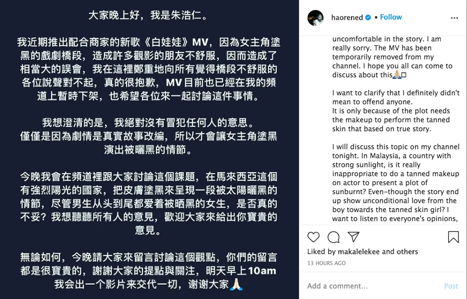Haoren defended his MV on his Instagram post which promoted the video. He stated that it was inspired by his girlfriend Gladish who used to become very tanned in school. “My artwork is imitating people who got tanned by the sun in Malaysia…” he commented.