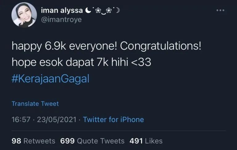 “Happy 6.9k everyone! Congratulations! Hopefully tomorrow we’ll reach 7k hihi <33” the “Teman” singer tweeted, along with the hashtag “#KerajaanGagal”. Because of that, Iman has been badly criticised by netizens over her insensitive trait.