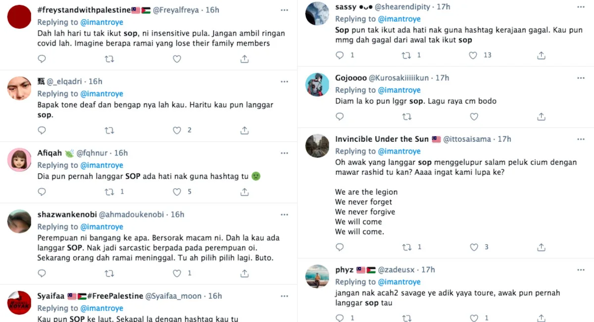 “Frontliners are exhausted, people are dying. Yet you have the gut to actually tweet ‘Hopefully tomorrow will reach hihi <33’ like its a joke?? So f**king insensitive,” Twitter user @aisyahjkm remarked. “Covid-19 has taken so many lives and souls. Yeah, it’s funny until it happens to you or your family. Iman Troye should be banned from this industry. Embarrassing.”