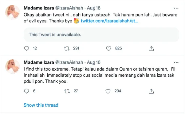 She responded by tweeting, “I find this (criticism) too extreme. But if it’s already written in the Al-Quran, InsyaAllah (God wills), I’ll immediately stop because I haven’t cared much about social media for a long time. Thank you.”
