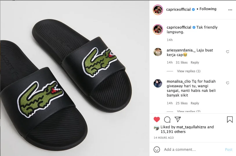 Meanwhile, Caprice (real name Ariz Ramli) uploaded a photo of a pair of Lacoste-branded slip-on sandals on his account. The rapper wrote, “Not friendly at all,” seemingly poking fun at the current situation involving Lofa and Fipper. Check out their posts here: