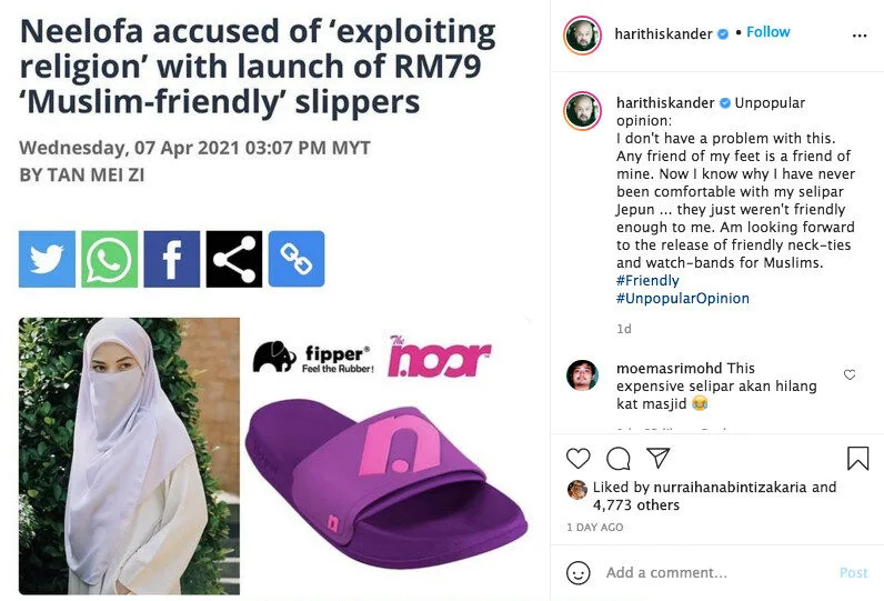 “I don’t have a problem with this. Any friend of my feet is a friend of mine. Now I know why I have never been comfortable with my ‘selipar Jepun’ (flip flops). They just weren’t friendly enough to me. Am looking forward to the release of friendly neck-ties and watch-bands for Muslims,” Harith expressed.