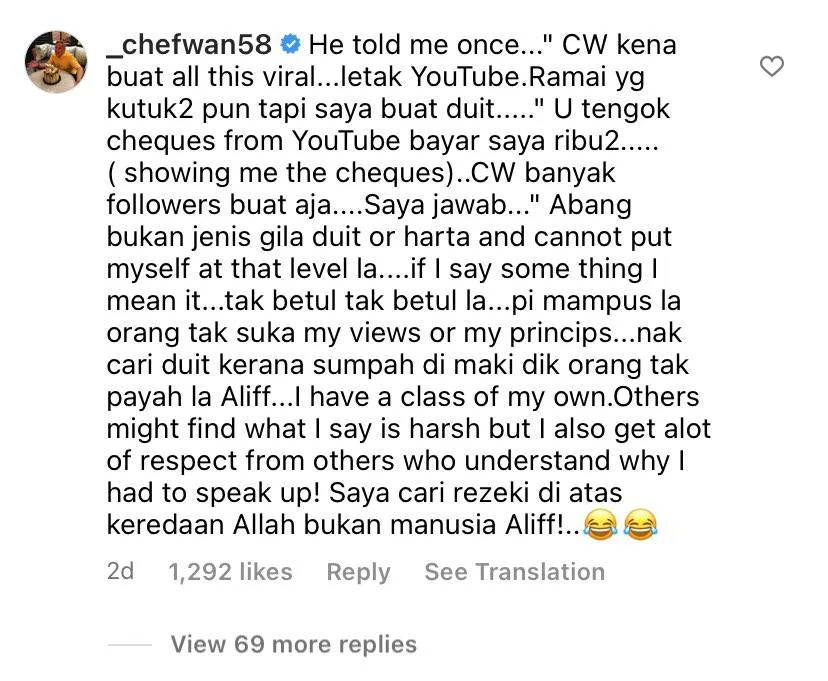 “If I say some things, I mean it by heart. Those who don’t agree with my views or my principles can go to hell! I have a class of my own. There’s no need to earn money from public criticism, Aliff. Others might find what I say is harsh but I also get a lot of respect from others who understand why I had to speak up! I’m making money to seek the pleasure of God, not to impress other people, Aliff!” he further added in his lengthy comment.