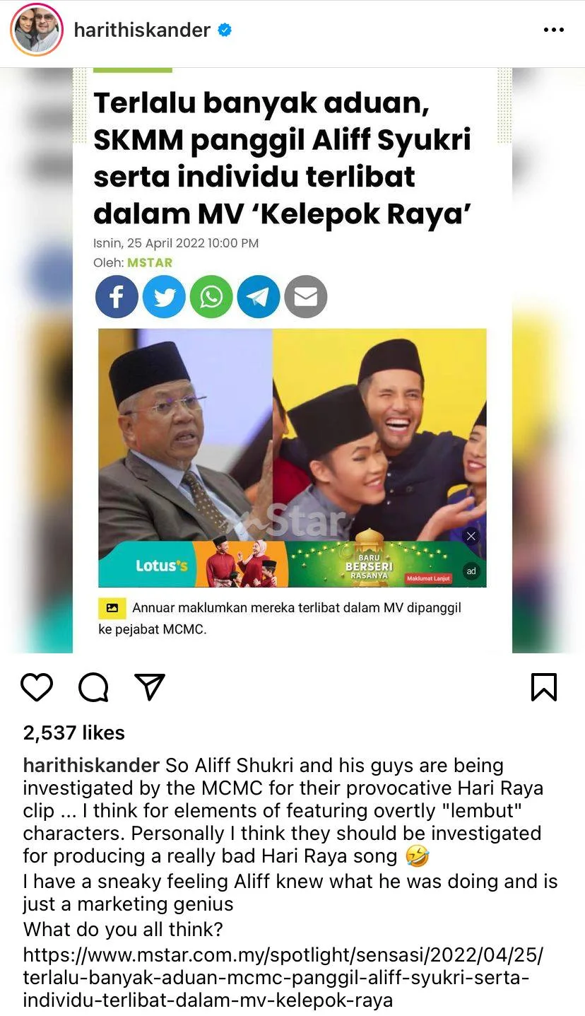 In a post shared on his socials, the comedian uploaded a screenshot of an article by mStar. “So Aliff Shukri and his guys are being investigated by the MCMC for their provocative Hari Raya clip. Personally I think they should be investigated for producing a really bad Hari Raya song 🤣 I have a sneaky feeling Aliff knew what he was doing and is just a marketing genius,” Harith remarked.