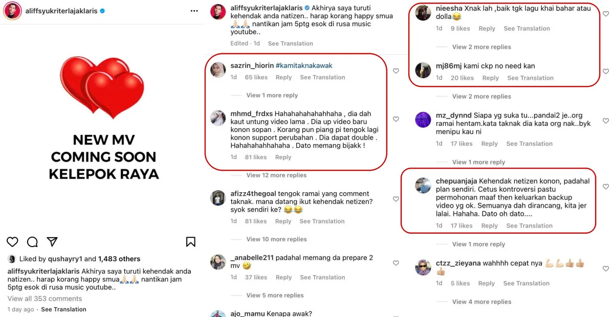 However, the news was not well-received by netizens on social media. Most of them weren’t keen on Aliff’s upcoming “Kelepok Raya” MV. “We don’t want you,” Instagram user @sazrin_haorin commented. “He already gained enough from the first video. And now he wants to come out with a more decent version of the MV. Afterwards, all of the fans will go and watch the video. His payment will be doubled. How smart.”