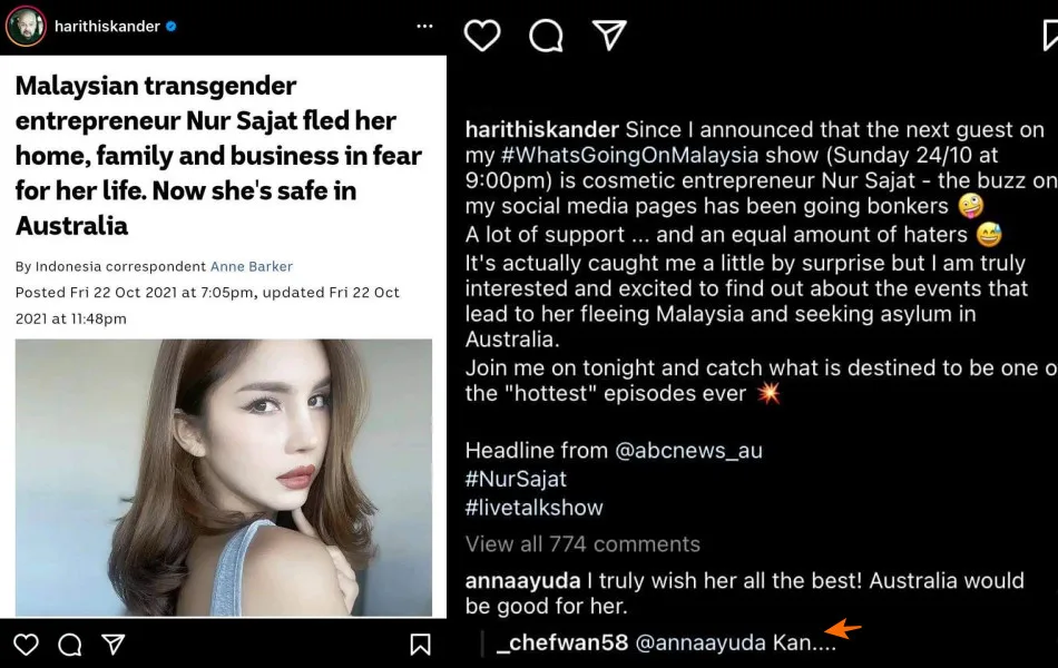 Prior to going live, Harith revealed on his Instagram that had been attacked by netizens soon after he announced that Sajat would be joining him for the session. “A lot of support, and an equal amount of haters,” the “Hanya Kawan” director commented. “It actually caught me a little by surprise, but I’m truly interested and excited to find out about the events that led to her fleeing Malaysia and seeking asylum in Australia.”