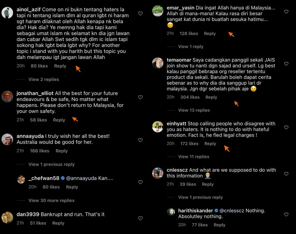 After the broadcast concluded, a check on the 55-year-old’s IG account showed that there were a few netizens who were clearly against Harith’s opinion on this matter. One IG user slammed him, saying, “Stop calling people who disagree with you as haters. It has nothing to do with hateful emotion. Fact is, she fled legal charges.”