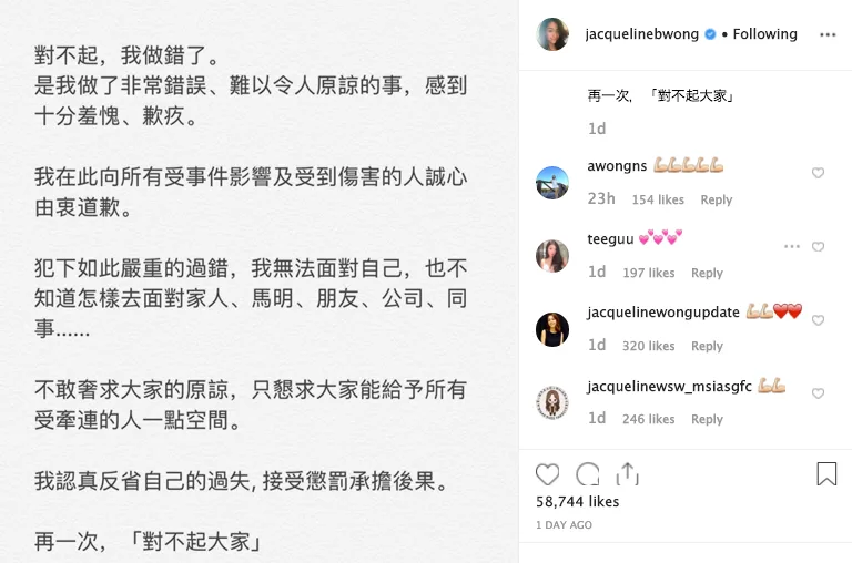 Even her sister Scarlett Wong received the hit as a large number of netizens flocked to her Instagram page to leave negative comments about Jacqueline. After receiving so many negative comments, Scarlett has decided to unfollow her sister on Instagram.