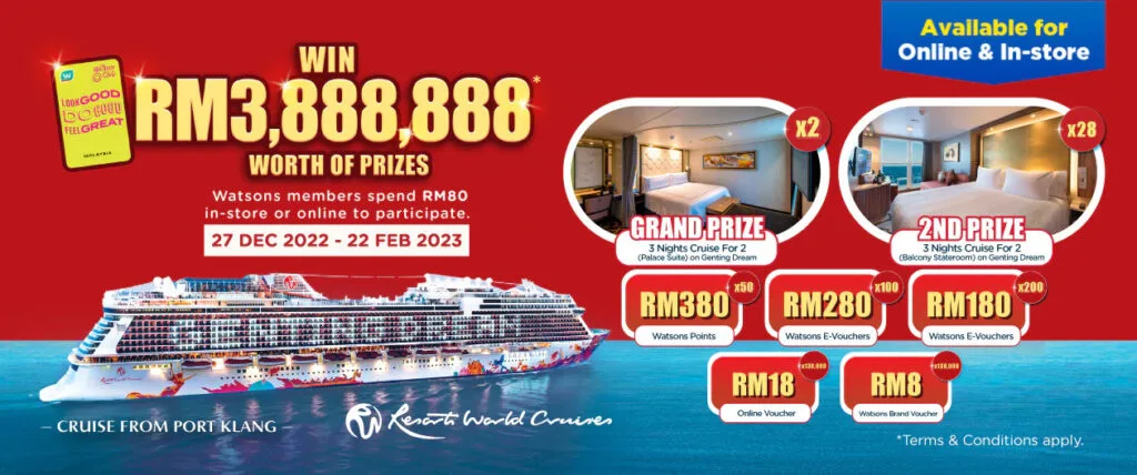 To be in the running to win these prizes, just shop at Watsons Malaysia! Watsons Club members must spend RM80 in a single transaction in-store or online until 22nd February 2023, to be eligible for rewards valued up to RM3,888,888.