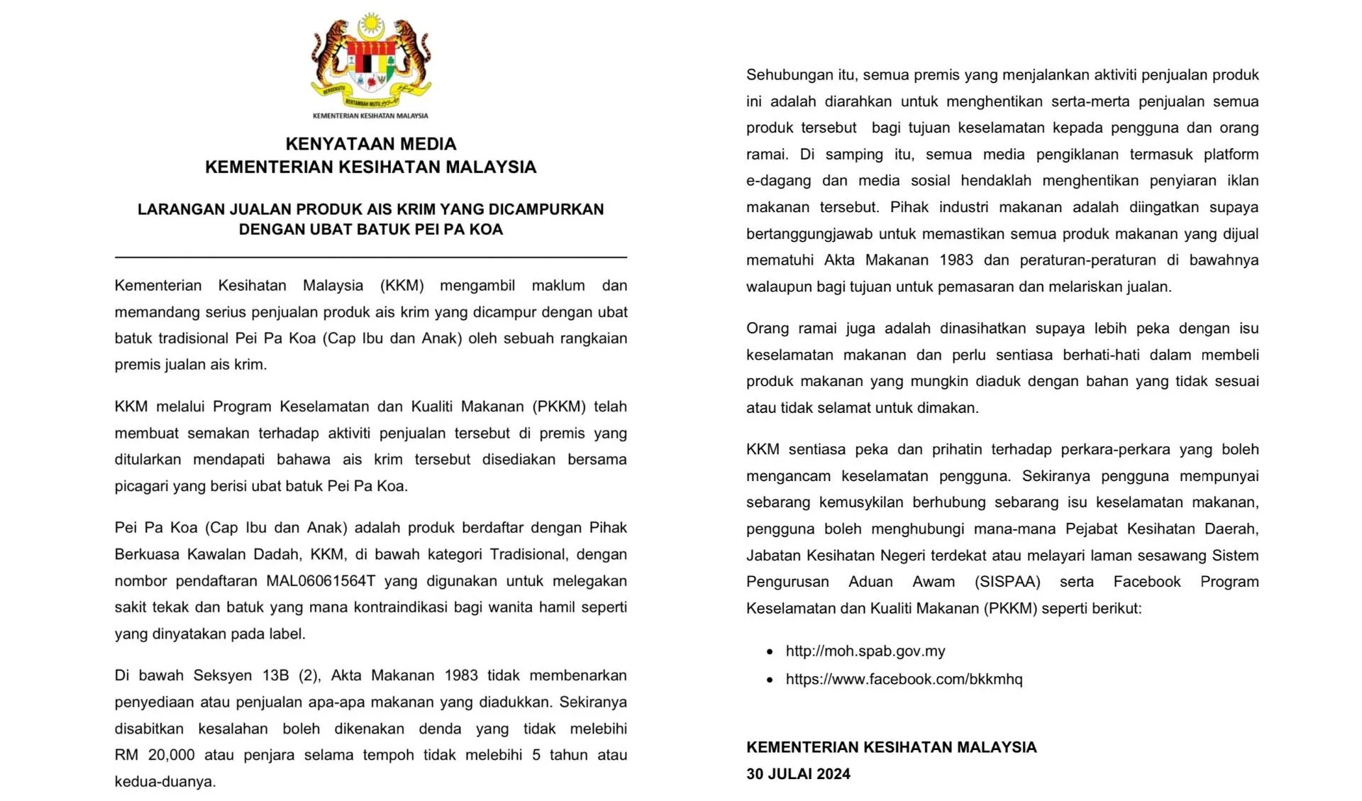 The Ministry emphasised that failure to abide by the order would constitute an offence punishable by up to five years’ imprisonment, a fine of no more than RM20,000, or both, upon conviction.