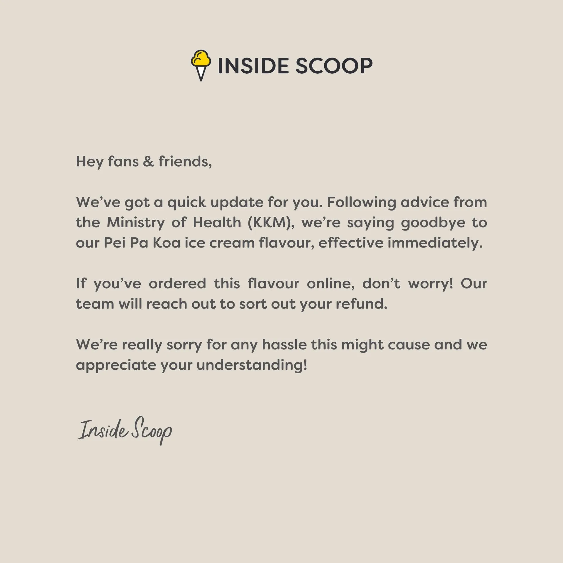Meanwhile, as of 6pm today, Inside Scoop had pulled the item from its menu, and issued a statement on X, explaining that it is discontinuing its Pei Pa Koa ice cream with immediate effect, on advice from the Health Ministry.
