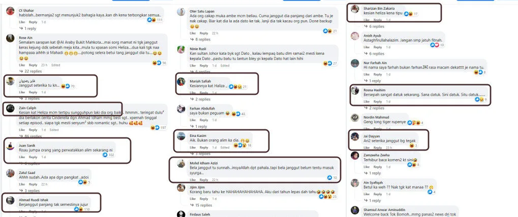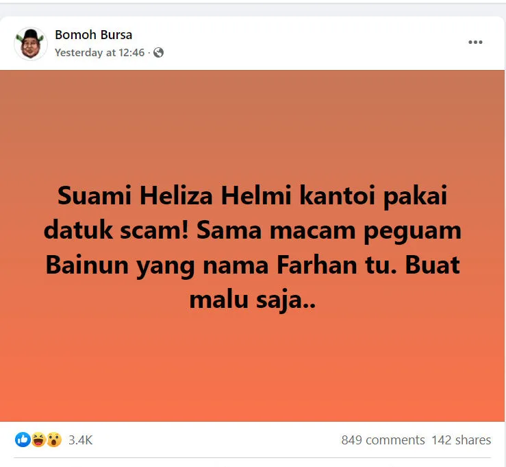 “Heliza Helmi’s husband has been exposed to scamming his Datukship title! The case is similar to the lawyer representing Siti Bainun known as Farhan. They’re bringing nothing but shame,” Bomoh Bursa wrote on their Facebook. At the time of writing (Thursday, 29th September), the post has been flooded with over 800 reactions from local netizens.