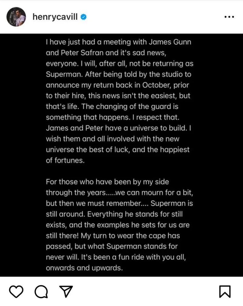 After announcing his return as the character back in October, Henry recently shared a post on his Instagram to inform fans of his departure from the DC Extended Universe (DCEU). According to the actor, he had just met up with writer James Gunn and producer Peter Safran and after much discussion, it has been decided that he will not be reprising his role as the iconic DC superhero.
