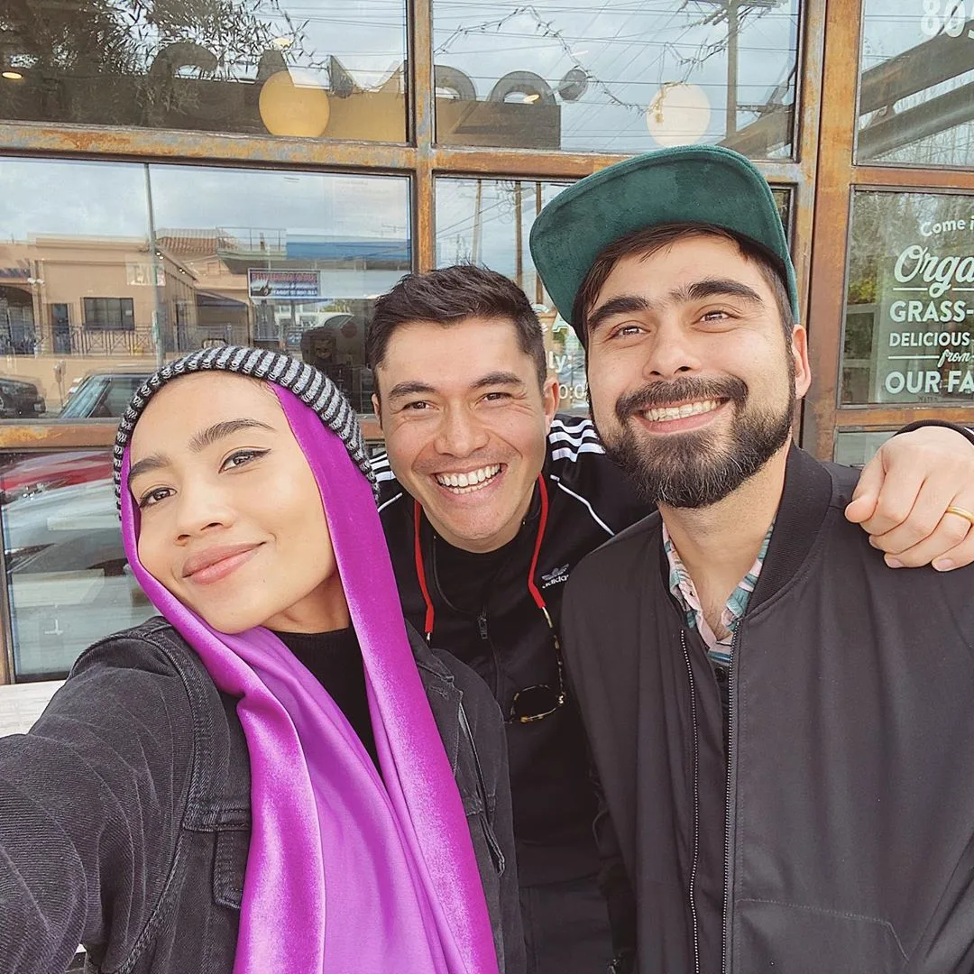 The trio were all smiles as they pose for a wefie in-front of a restaurant in Los Angeles, California.