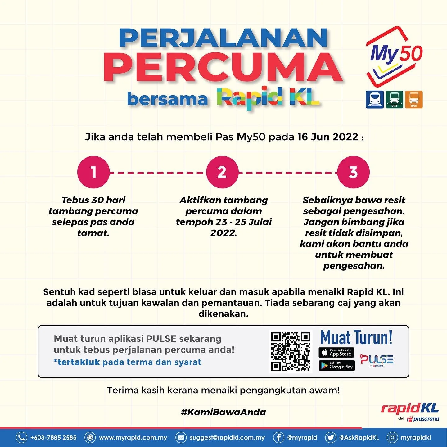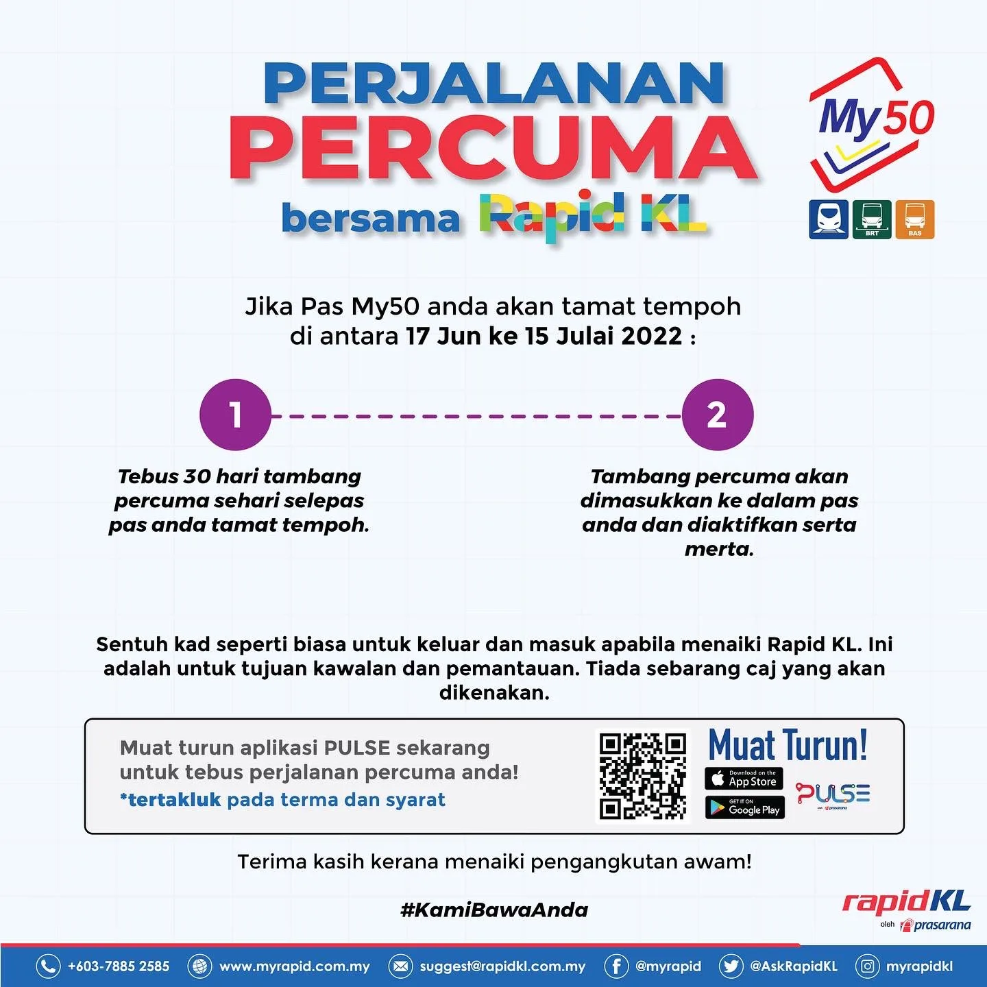 A minimum of RM5 must still be maintained in the My50 pass, Touch ‘N Go card, and concession card to enter and ride any RapidKL rail or bus services. Additionally, the sales of Keluarga Malaysia Pass (KMP), MyCity Pass 1-day, and MyCity Pass 3-day will be held from 16th June to 15th July.