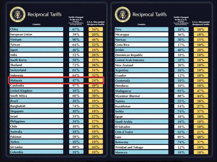 A reciprocal tariff means that if one country charges high taxes (tariffs) on Malaysian goods entering their country, then Malaysia will do the same to that country’s goods entering Malaysia. This means that the 24% reciprocal tariff that Trump imposed on Malaysia results in Malaysian goods being more expensive in the U.S. Unfortunately, that also means American-made items will greatly increase in price when sold to Malaysians.